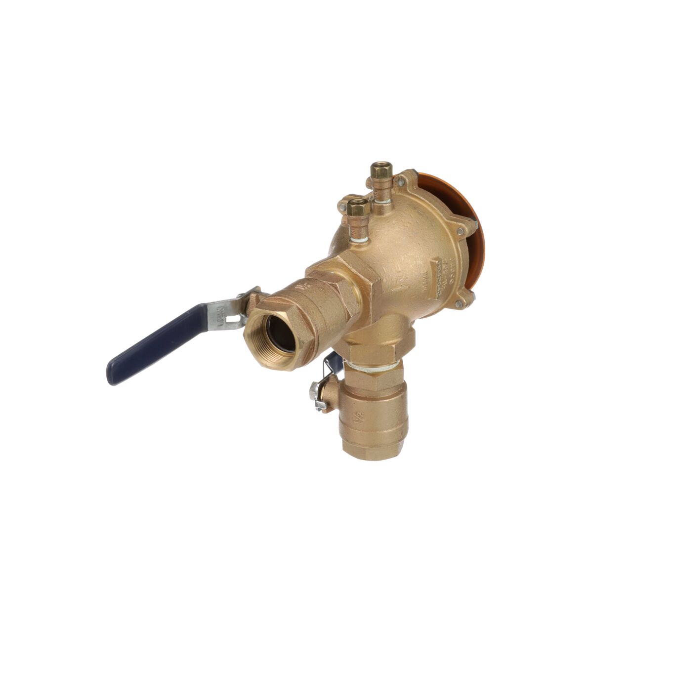 This 1 1/2 inch pressure vacuum breaker backflow preventer is used to protect against health hazard and non-hazard backsiphonage of toxic or non-toxic liquids in industrial plants, cooling towers, laboratories, laundries, swimming pools and irrigation systems. It has a bronze body, spring loaded check valve, air relief valve with opening port, two resilient seated shutoffs and test cocks, and NPT end connections. This assembly meets the specifications of the USC FCCCHR Manual. The maximum working pressure is 150 psi (10.3 bar) and temperature range is 32 degrees F to 140 degrees F (0 degrees C to 60 degrees C).