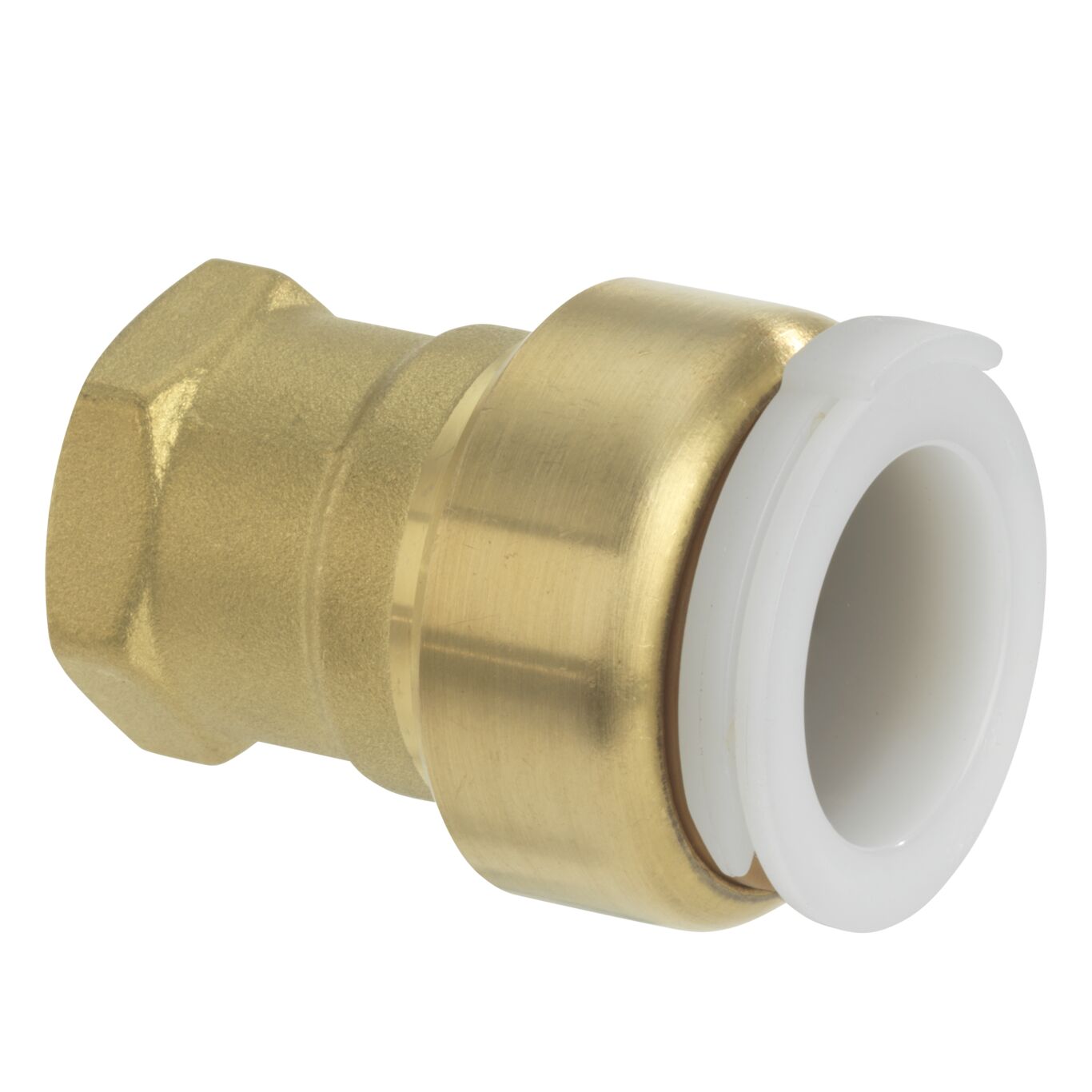 This 1/2 inch PVC IPS x 1/2 inch NPT AquaLock(TM) brass female adapter connects schedule 40 PVC pipe to copper, CPVC, PEX, and CTS rated pipe. It is easy to install, no tools or tube inserts are required. The fitting can be used for hot and cold water applications. The unique O-ring guide feature provides a zero-leak connection. Unlike barb fittings, this fitting joins the tubing on the outside, increasing the flow capacity. After a connection has been made even under maximum pressure, the tubing is able to swivel, making the fitting ideal for vibrating and dynamic applications.