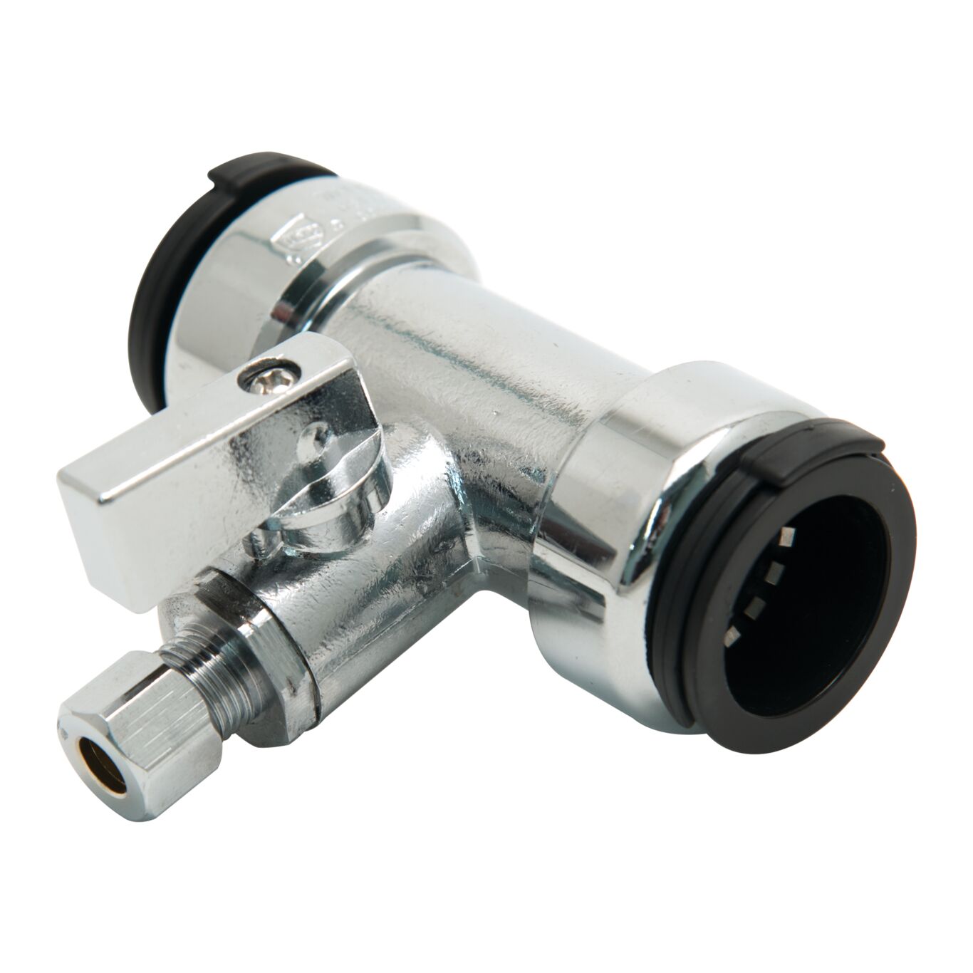 This 3/4 inch CTS x 3/4 inch CTS x 1/4 inch compression AquaLock(TM) brass tee valve works with copper, CPVC, PEX, and CTS rated pipe. It is easy to install, no tools or tube inserts are required. The fitting can be used for hot and cold water applications. The unique O-ring guide feature provides a zero-leak connection. Unlike barb fittings, this fitting joins the tubing on the outside, increasing the flow capacity. After a connection has been made even under maximum pressure, the tubing is able to swivel, making the fitting ideal for vibrating and dynamic applications.