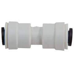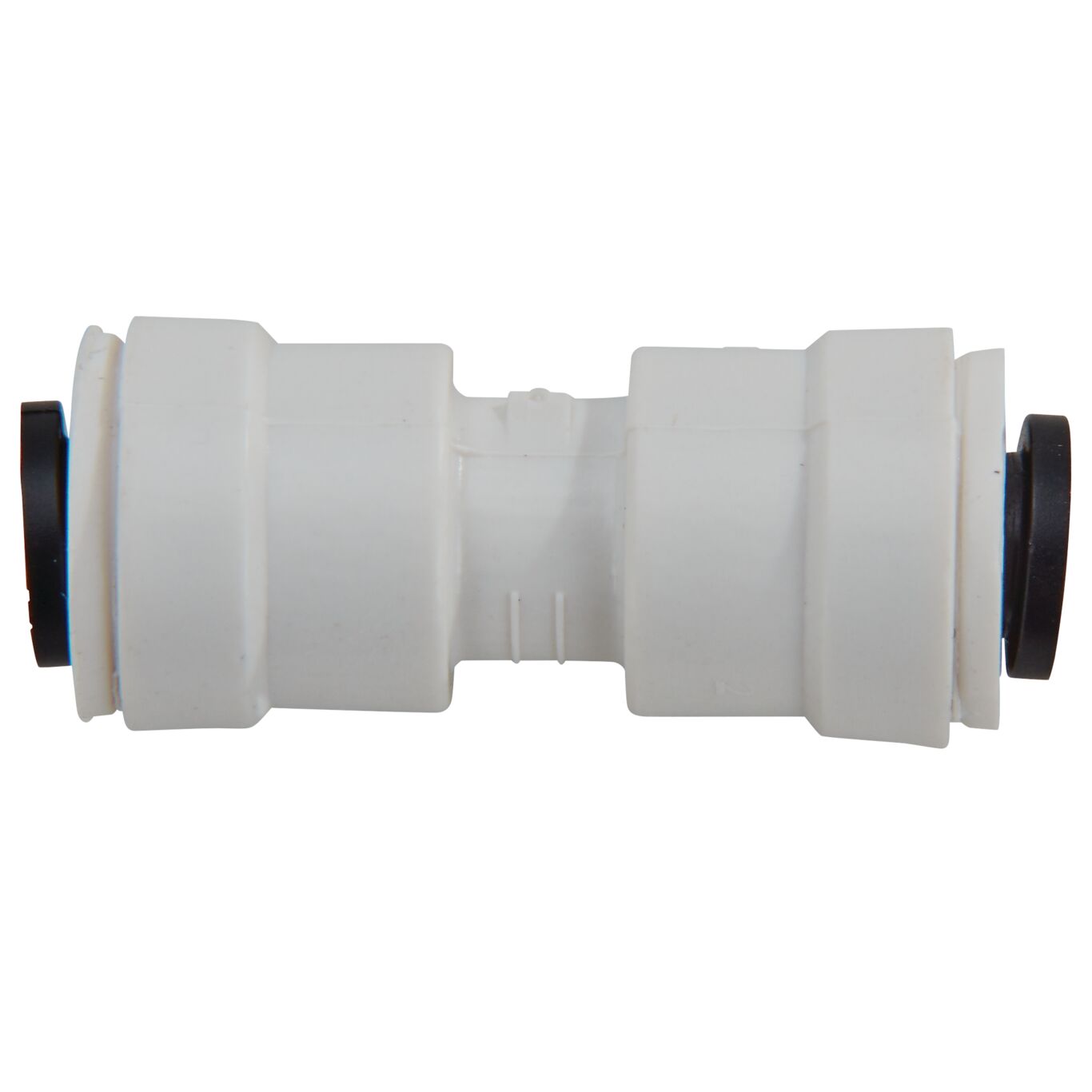 This 1/4 inch OD AquaLock(TM) mini coupling works with plastic or soft copper tubing. It is easy to install, no tools or tube inserts are required. The fitting can be used for hot and cold water applications. The unique O-ring guide feature provides a zero-leak connection. Unlike barb fittings, this fitting joins the tubing on the outside, increasing the flow capacity. After a connection has been made even under maximum pressure, the tubing is able to swivel, making the fitting ideal for vibrating and dynamic applications.
