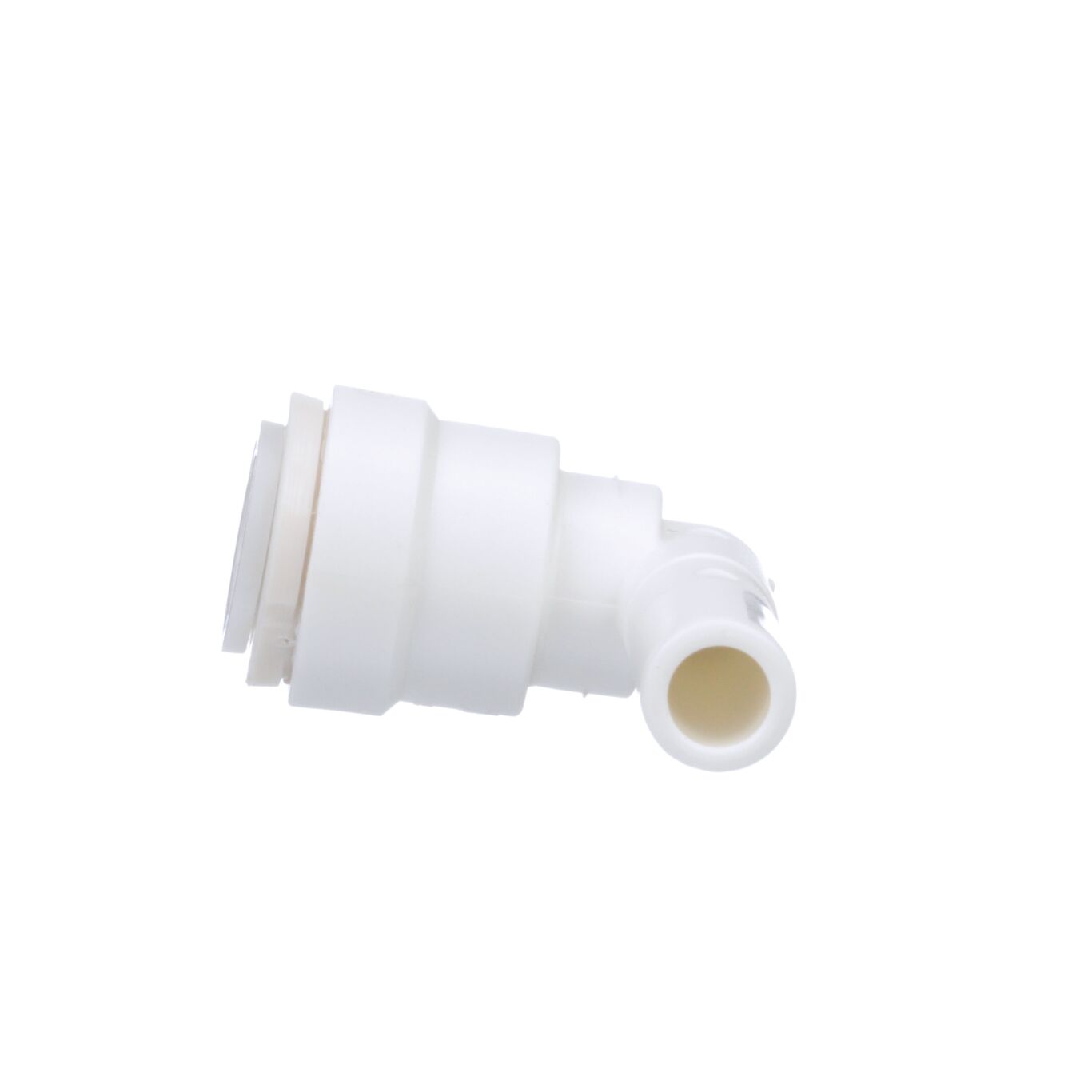 This 3/8 inch OD AquaLock(TM) mini stackable elbow works with plastic or soft copper tubing. It is easy to install, no tools or tube inserts are required. The fitting can be used for hot and cold water applications. The unique O-ring guide feature provides a zero-leak connection. Unlike barb fittings, this fitting joins the tubing on the outside, increasing the flow capacity. After a connection has been made even under maximum pressure, the tubing is able to swivel, making the fitting ideal for vibrating and dynamic applications. Available in bulk quantities as contractor pack.