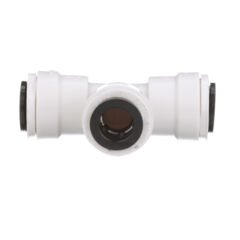 This 3/8 inch OD AquaLock(TM) mini tee works with plastic or soft copper tubing. It is easy to install, no tools or tube inserts are required. The fitting can be used for hot and cold water applications. The unique O-ring guide feature provides a zero-leak connection. Unlike barb fittings, this fitting joins the tubing on the outside, increasing the flow capacity. After a connection has been made even under maximum pressure, the tubing is able to swivel, making the fitting ideal for vibrating and dynamic applications. Available in bulk quantities as contractor pack.