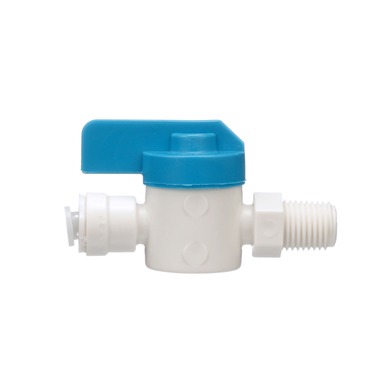 This 1/4 inch OD x 1/4 inch OD NPT AquaLock(TM) mini straight valve works with plastic or soft copper tubing. It is easy to install, no tools or tube inserts are required. The fitting can be used for hot and cold water applications. The unique O-ring guide feature provides a zero-leak connection. Unlike barb fittings, this fitting joins the tubing on the outside, increasing the flow capacity. After a connection has been made even under maximum pressure, the tubing is able to swivel, making the fitting ideal for vibrating and dynamic applications.