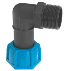 This 1 1/4 inch x 1 1/4 inch male elbow is manufactured from high grade fiberglass reinforced nylon. It is non corrosive; using high quality materials approved for use with drinkable water. Designed to connect a range of ID nominally sized polyethylene pipe, tube and hose with varying wall thicknesses. Connection can be made by hand, without tools. It is re-usable and utilizes a unique way to connect pipe without the need for multiple replacement parts. The unique blue captive nut seals stays on the ridge and seals the pipe on the ridge. Male NPT inlet and barb outlet connection type, fits 1 1/4 inch nominally sized polyethylene pipe, tube and hose. Used for the most rigorous agricultural and horticultural uses. Maximum pressure is 230 psi and maximum temperature is 140 degrees F.