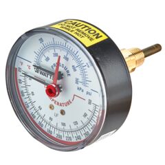 This 1/4 inch lead free center back entry pressure temperature gauge is used in commercial, residential, and institutional HVAC applications. It features a black enamel steel case, Kostil polymer window, 1/2 inch NPT connection, bimetal spiral spring, extended mounting nut, and copper alloy Bourdon tube pressure element with ASME Type B accuracy. This gauge features a 3 inch dial with pressure rating scale from 0 to 75 psi and temperature range 60 to 320 degrees F.