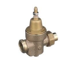 This 3/4 inch water pressure reducing valve is used in commercial and residential applications to reduce incoming water pressure to protect plumbing system components and to reduce water consumption. It has a lead free brass body construction, solder union inlet by NPT female outlet connection, integral stainless steel strainer, thermoplastic seat, bronze sealed spring cage for accessible outdoor waterworks or pit installations and a thermal expansion bypass. The temperature range is 33 to 180 degrees F (0.5 to 82 degrees C). Suitable for up to 400 psi (27.6 bar), the pressure range can be adjusted from 25 to 75 psi (172 to 517 kPa) with the standard setting at 50 psi (345 kPa).