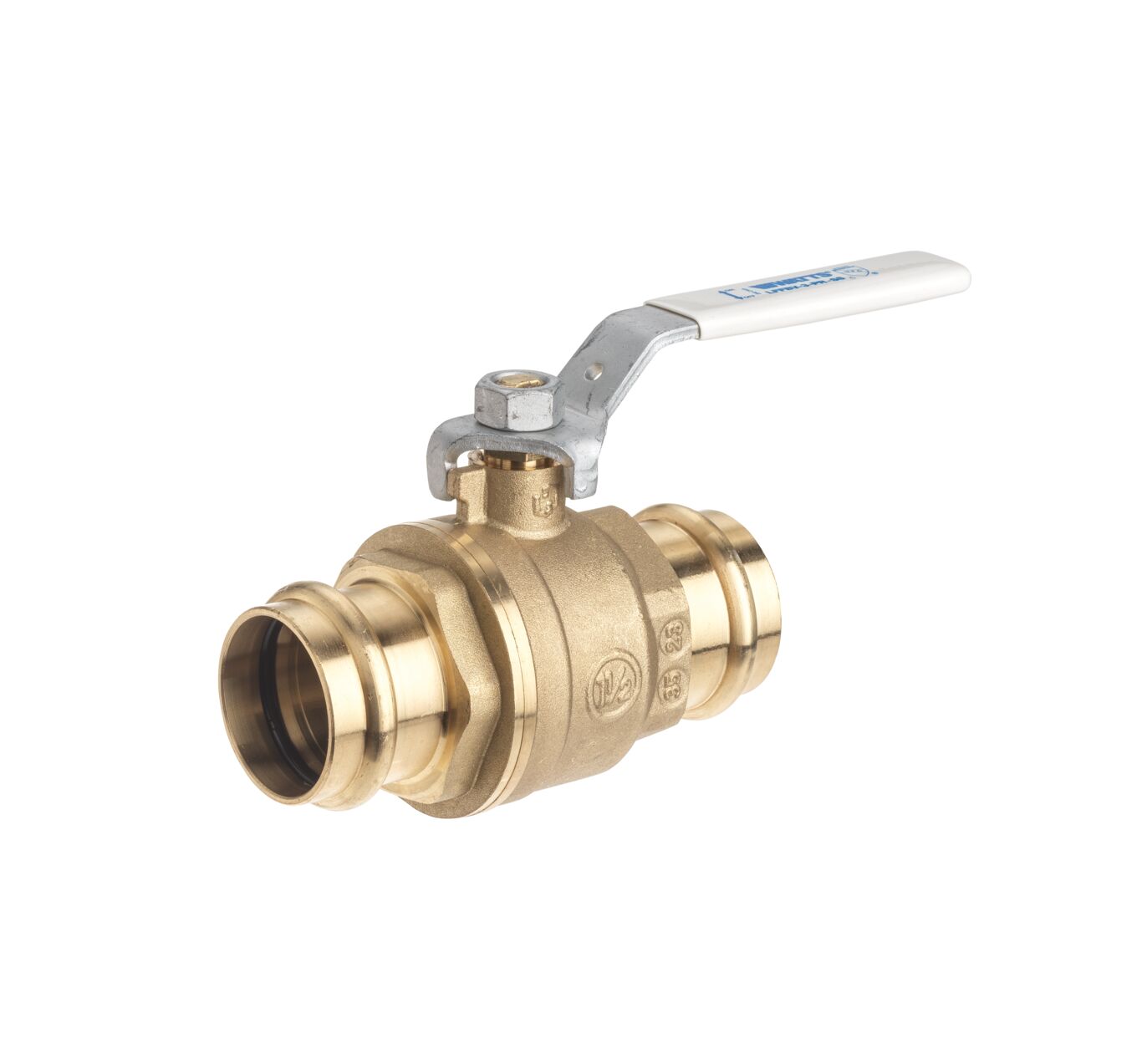 This 1 1/2 inch lead free two-piece, full port, ball valve with integral press end fittings and stainless steel ball and stem is designed for use in plumbing, heating, and potable water applications. It features a lead free brass body, adjustable packing gland, and bottom-loaded blowout proof stem. It is made with integral ASTM-B88 compliant press end connections that are designed for types K, L and M hard copper tubing. The press fitting is rated to 250 psi CWP up to 210 degrees F.