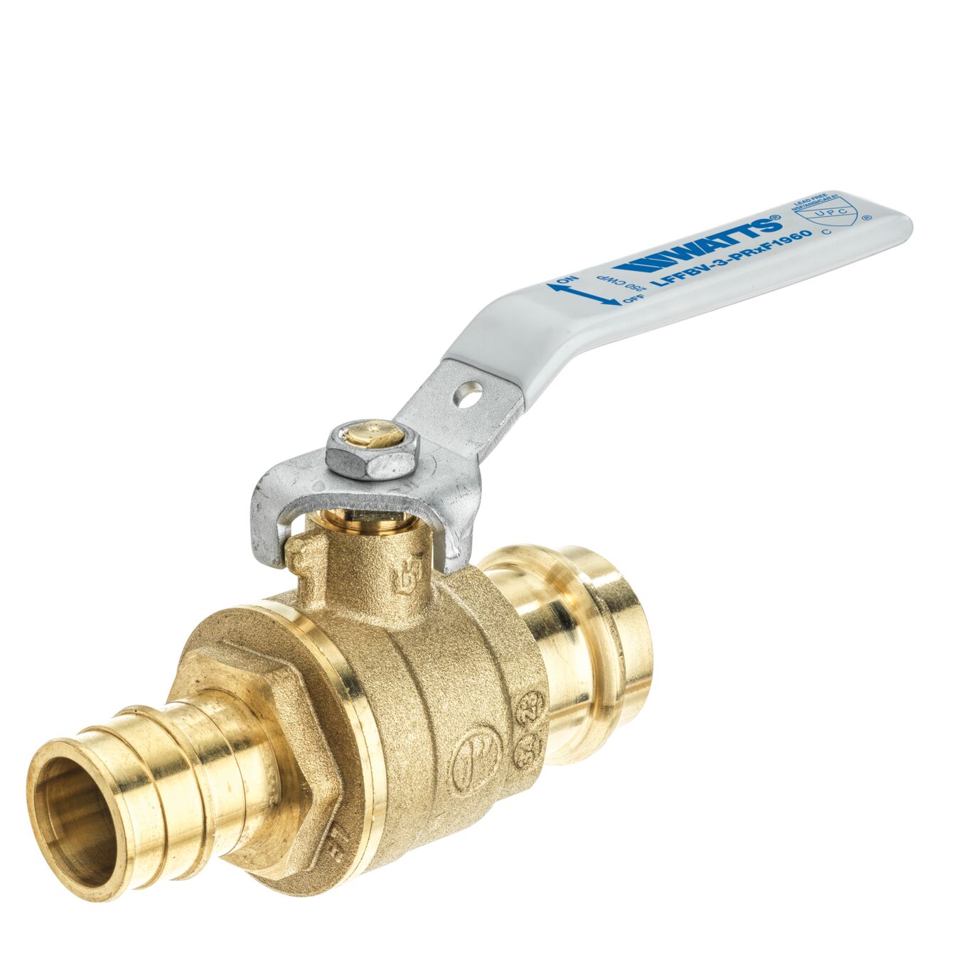 This 1 inch lead free two-piece, full port, ball valve with press x F1960 connections is designed for use in plumbing, heating, and potable water applications. It features a lead free brass body, adjustable packing gland, and bottom-loaded blowout proof stem. This valve facilitates easy transition from copper tubing to PEXa tubing. It's made with integral ASTM-B88 compliant press end connections on one end, with ASTM F1960 compliant PEX end connections on the other. The F1960 PEX fitting is rated to 160 psi at 73 degrees F, and the press fitting is rated to 250 psi CWP up to 210 degrees F.